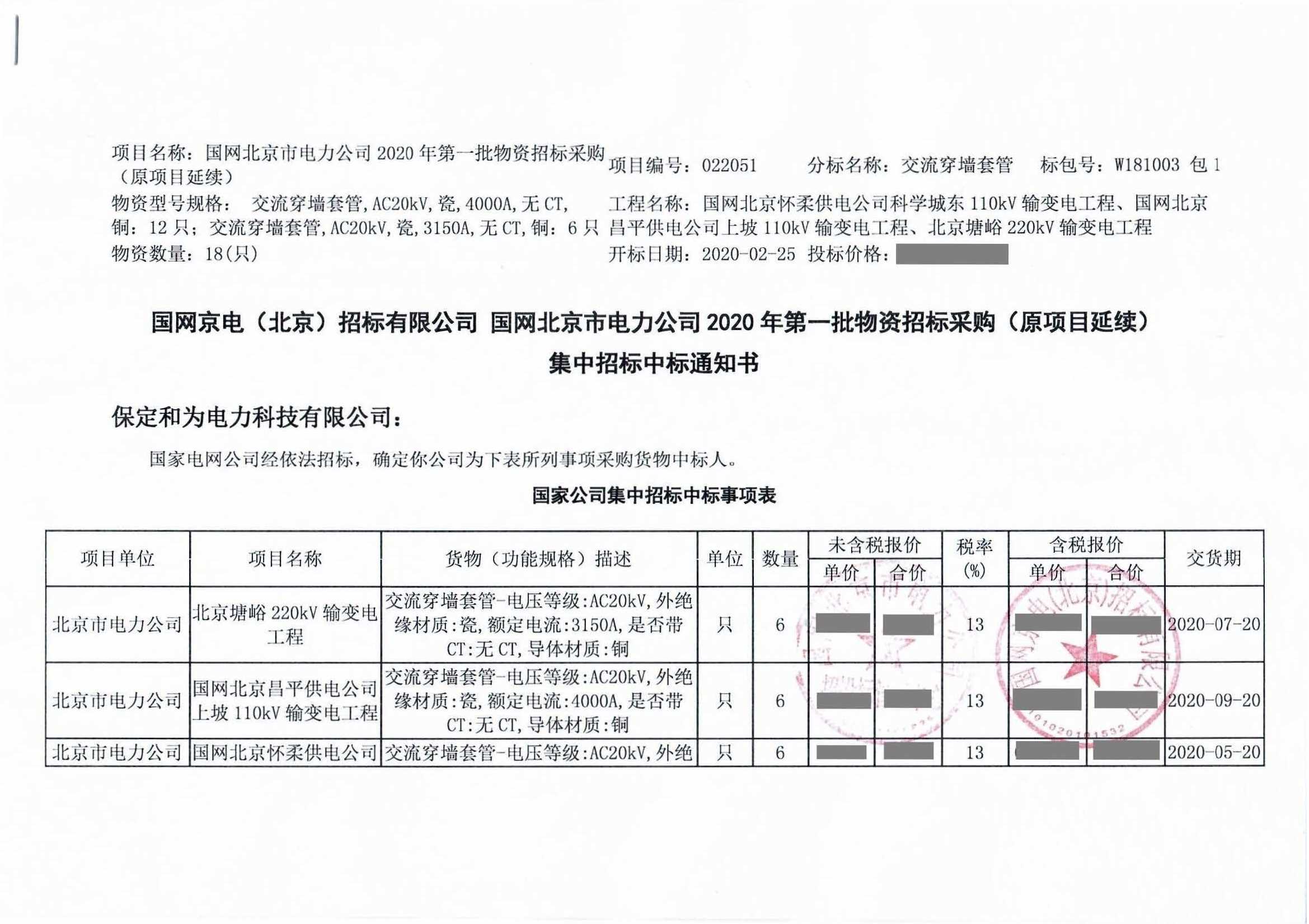 2020年3月份國(guó)網(wǎng)北京市電力高壓穿墻套管招標(biāo)項(xiàng)目中標(biāo)